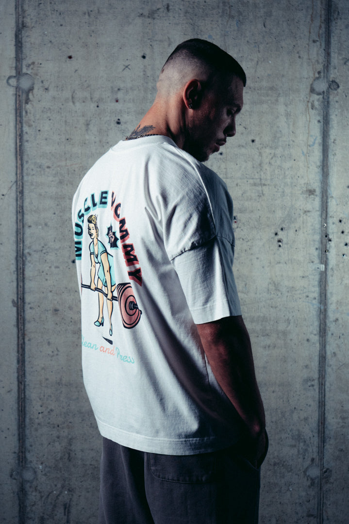 Short arm dropped shoulder pump cover unisex t-shirt. Oversized fit in a medium weight cotton. Ribbed crewneck collar. Perfect for the gym.