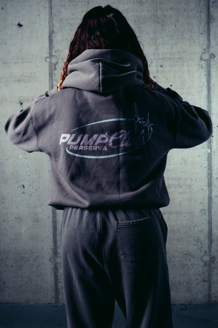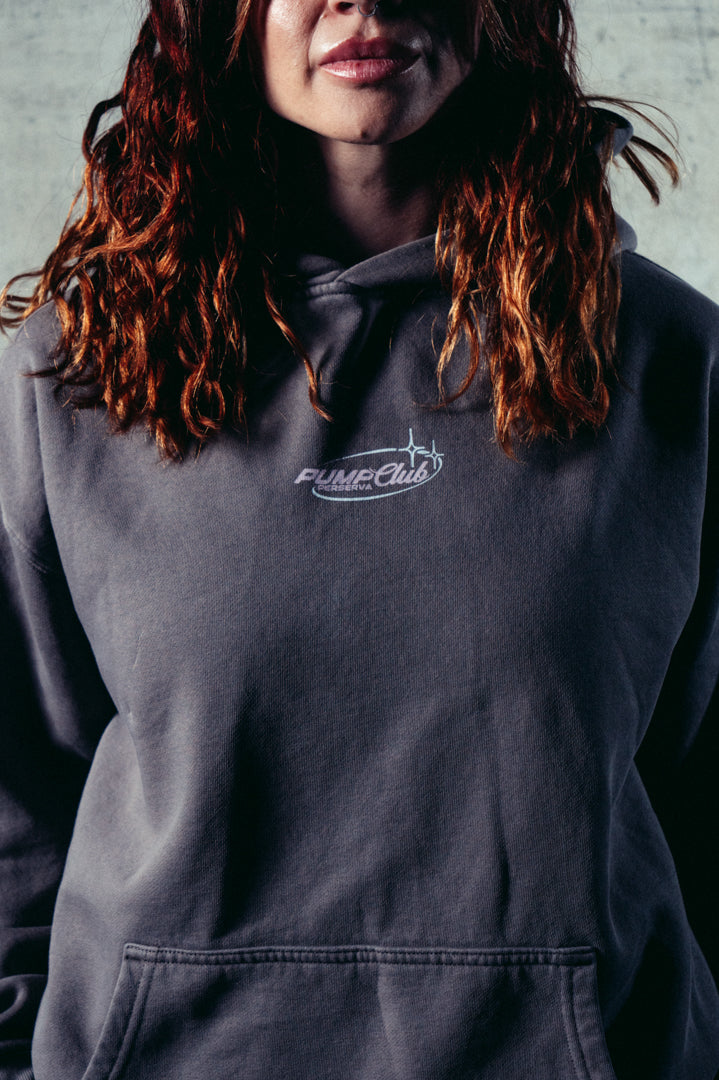 A sleek Grey faded hoodie featuring the Pink and White Pump Club logo on the front and rear.